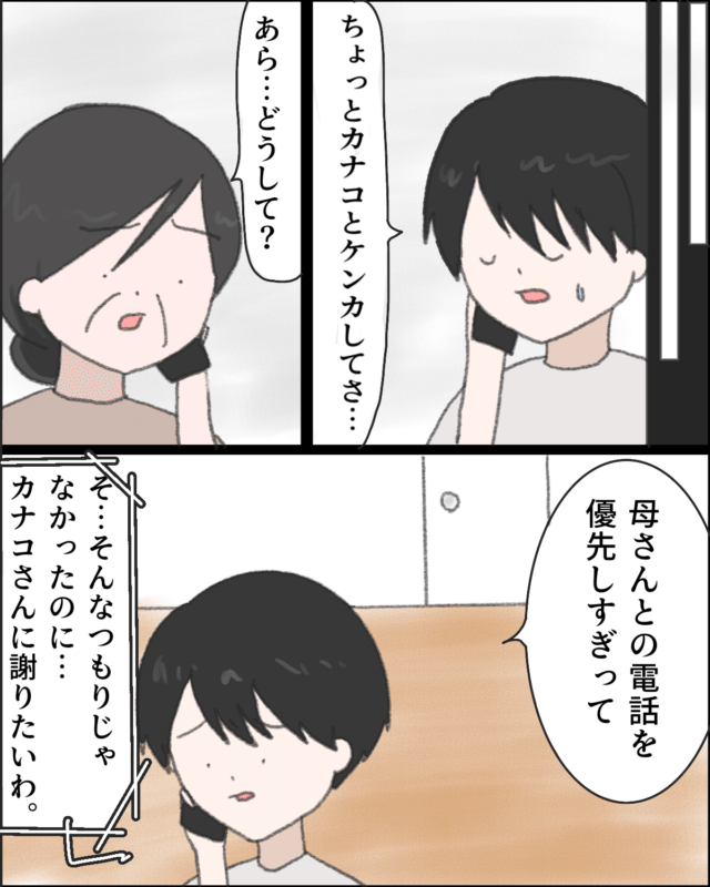 理由を聞くと、ユウタが私からの電話を優先しすぎると言ってカナコさんが怒ったようです。「そんなつもりじゃなかったのに。カナコさんに謝りたいわ。」とすぐに言いました。