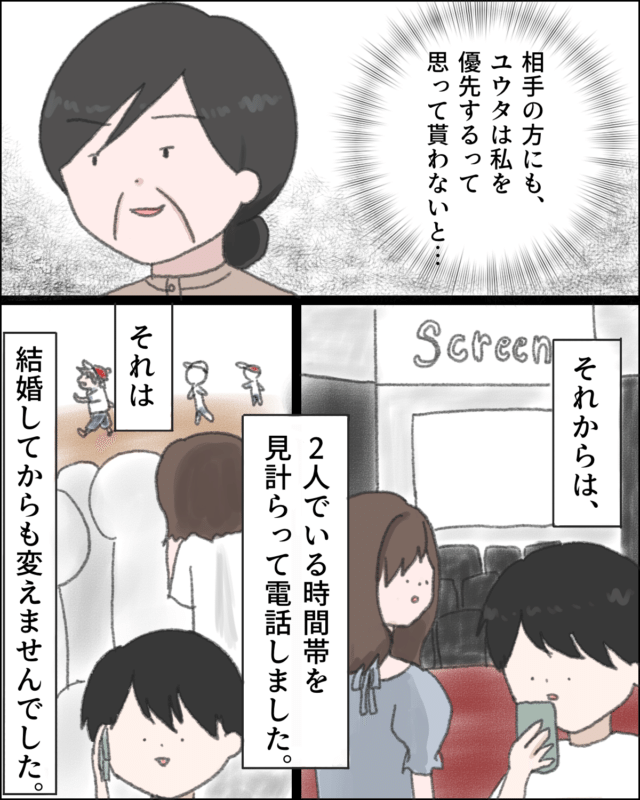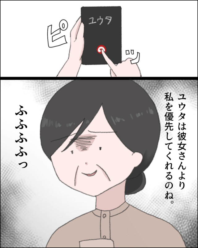 息子のユウタさんが転勤で実家を出てからとても寂しい思いをしているお母さんは、毎日ユウタさんが知らせてくれる1日の予定を見て、ユウタさんに時間がありそうなタイミングで電話をかけて話をするのを日課にし、心のよりどころにしていました。そんなある日いつものように電話で話していたユウタさんから付き合っている人がいると報告を受け、お母さんは自分がとても寂しい思いをしているのにユウタさんと楽しい時間を一緒に過ごしている彼女(現在の妻であるカナコさん)を疎ましく思ったのでした。