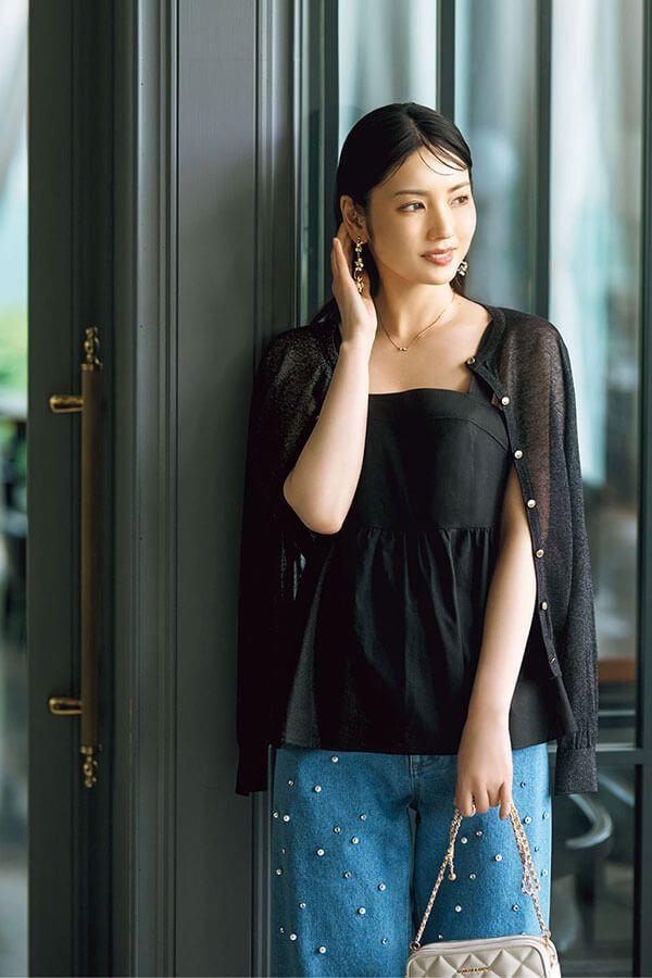 手持ちのシアーカーデのインにペプラムキャミを投入するだけで、センシュアルかつ可愛げ漂う粋なレイヤードに。