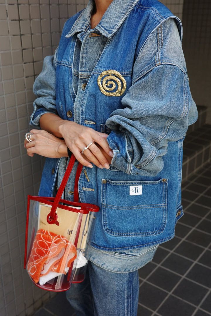 「ここぞとばかりにデニムアイテムを組み合わせてスタイリングしました。まず、デニムパンツはすっきりシルエットにしました。ボトムをスッキリさせた分、ルーズなジャケットと、同じくらい大きめサイズのデニムベストを上から重ね、デニムスタイルを楽しんでいます」