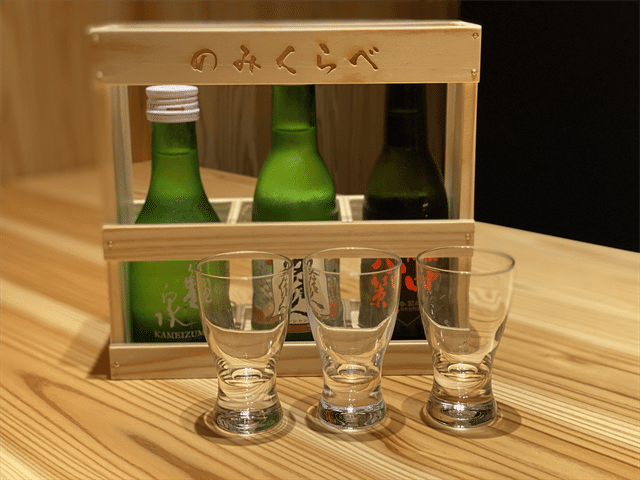 ドリンクは高知の日本酒3種飲み比べをチョイス。さすが酒豪の多い高知県……3種とも小さめボトルで提供されます。ソフトドリンクは、仁淀川ジンジャーエールのほか、文旦ドリンク、小夏ドリンク、ゆずドリンクなど、柑橘系ドリンクがそろっています。
