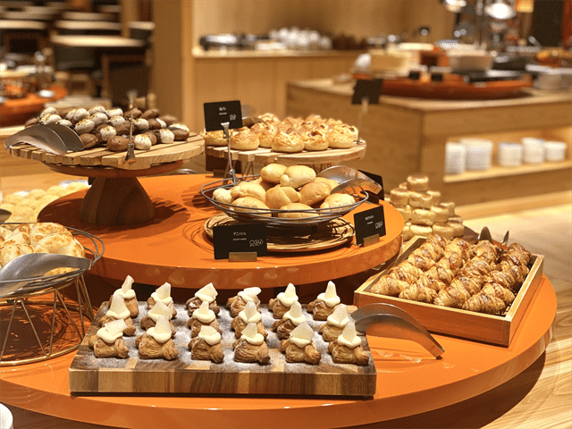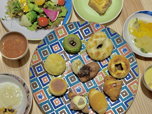 朝食のビュッフェでは、田舎寿司やじゃこ天などの郷土料理はもちろん、女性にうれしい小さいパンも種類豊富に並んでいます。クロワッサンや塩パン、チーズベーグル、ブリオッシュ、カレーパンなどなど、ミニサイズなのでいろいろ食べられるのがいいですね。