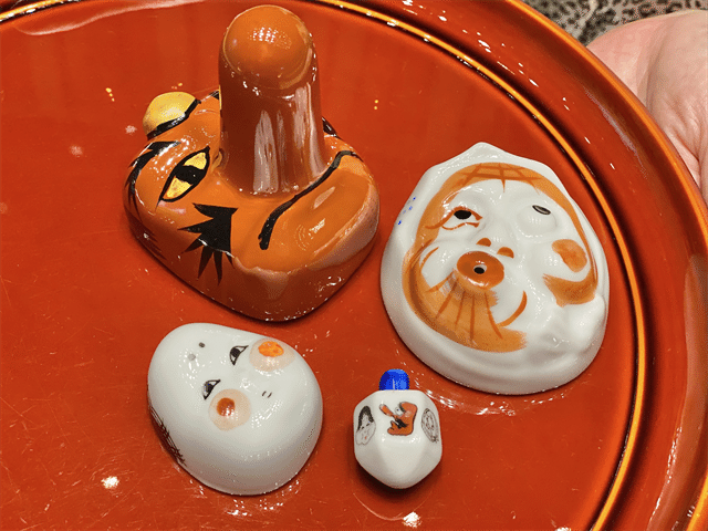 天狗、ひょっとこ、おかめにコマがセットになったべく杯。お座敷遊びでは、この3種の盃とコマを使って遊びます。コマを回し倒れたところで、表示されている3種のうちいずれかの盃でお酒を飲みます。お酒を注がれると、飲み終わるまで置くことができないという、楽しくも恐ろしい遊びです。