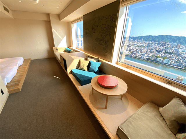 高知の宴会文化「おきゃく」をコンセプトにした客室は、8タイプ全133室。筆者が宿泊した、3名まで宿泊できる「うたげセミスイート」は眺望もよく、開放感もたっぷりです。窓側にソファが配されていて、鏡川や高知市街を一望しながら過ごせます。