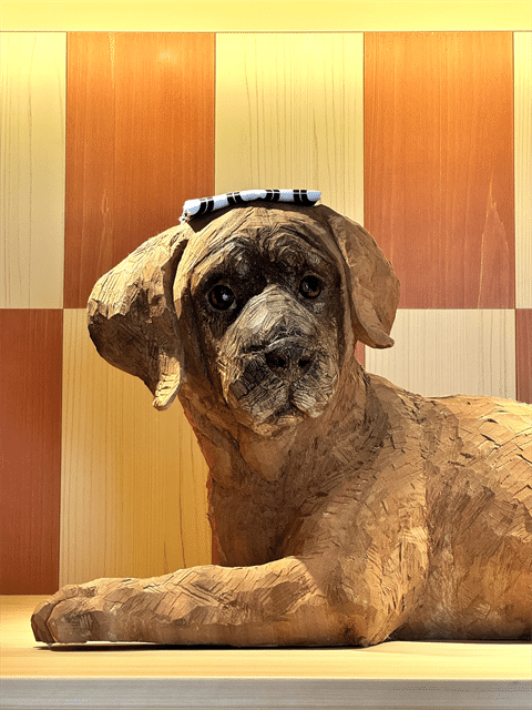 トサノユの入口にいる木彫りの土佐犬。なんとも言えない表情で見つめてきます