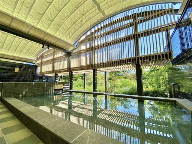 明るい時間と夜に入るのとでは、ガラリと印象が変わる露天風呂。明るい時間は特に、より開放的な雰囲気が楽しめます。露天風呂の前にある庭園は、植物学者、牧野富太郎博士が生まれ愛した土佐の原風景を模したもの。