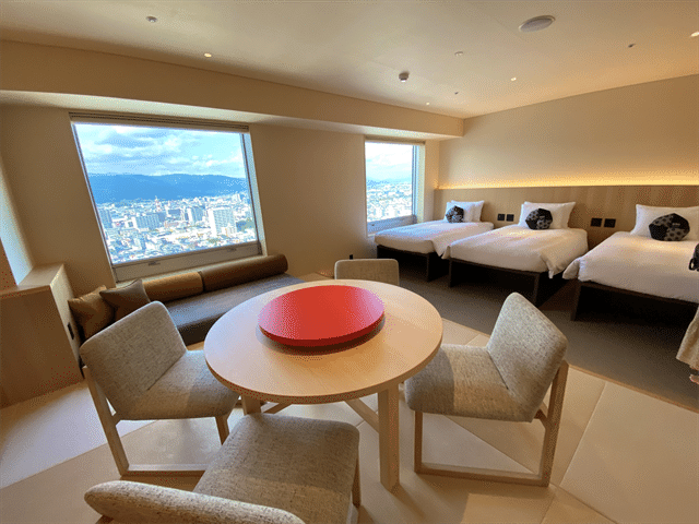 4名まで宿泊できる「うたげスイート」は、ソファとテーブルが配され広々。ベッドの下があいているので、スーツケースなど大型荷物の収納スペースとして使えるのもうれしいです。