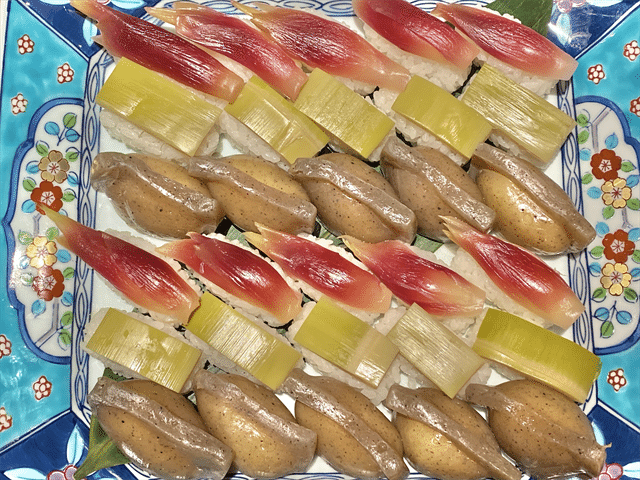 用意された大皿に料理をいろいろ盛って、皿鉢料理風にしてみました。宴会気分でいただきます!