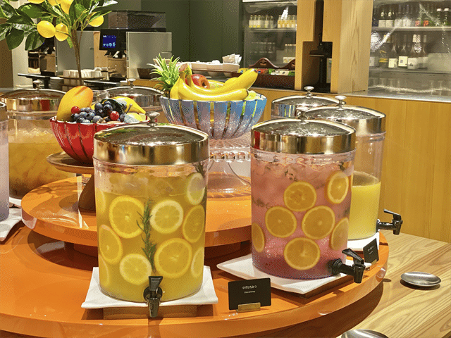 ゆず&はちみつ、グレープ&ピーチのフレーバーウォーターのほか、パイナップルジュースやアイスコーヒー、ほうじ茶、牛乳、水もあり