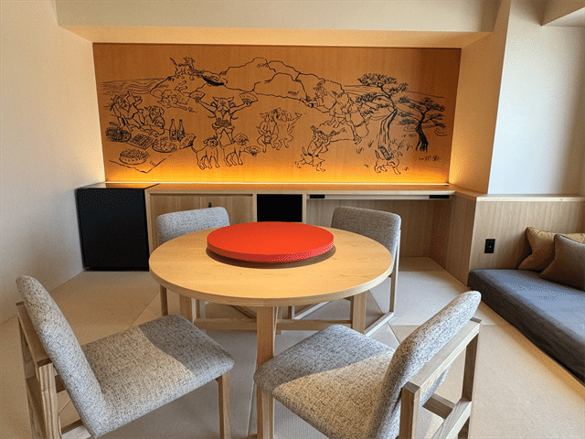 うたげスイート、うたげセミスイートともに、土佐犬が宴会を楽しむ様子を描いたウォールアートがあります。