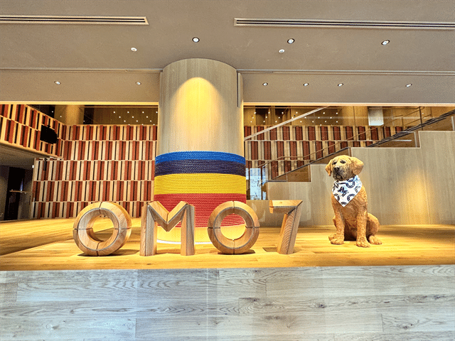OMO7高知のエントランスを入ると、大きな「OMO」のオブジェと、抜群の存在感を放つ木彫りの土佐犬が迎えてくれます。その奥には、空間を贅沢に使った開放感のある大階段が! 旅のわくわく感を盛り上げてくれます。