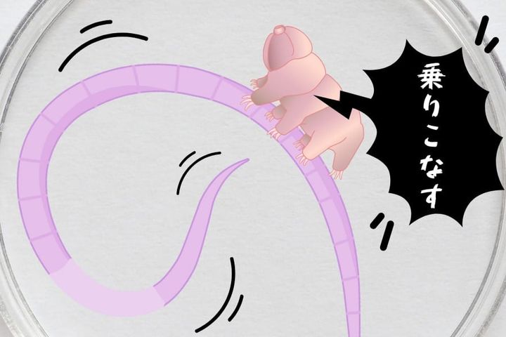 動画では、荒ぶる線虫の背中につかまっている小さなクマムシが映っており、まるで暴れ馬にまたがる騎手のようです。