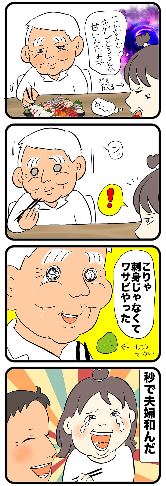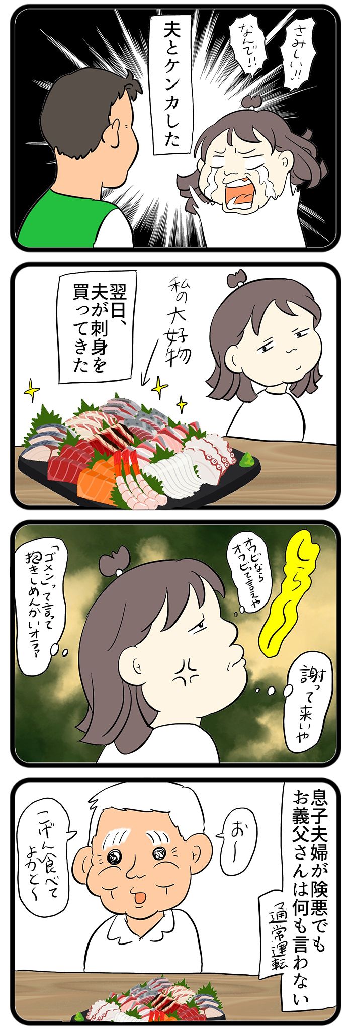 息子夫婦が剣悪でも、義父・マキオさんは何も言わず、通常運転。そして刺身を前に、和ませる…【しぶしぶ同居したら義父が最高だった件・55】