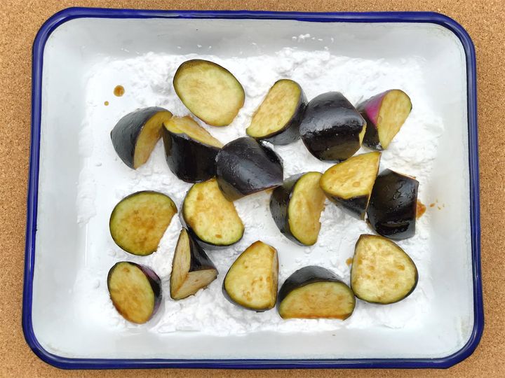 3. バットに片栗粉を広げ、2のなす全体にまぶします。