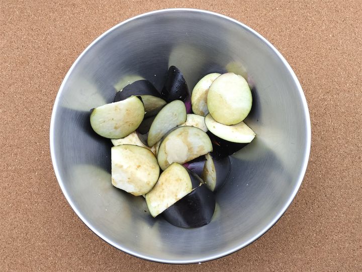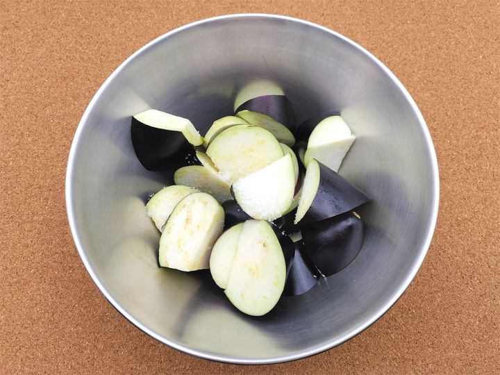1. なすをボウルに入れ、塩を加えてなじませて15分置きます。