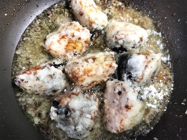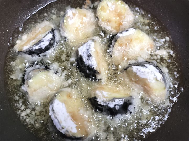 4. フライパンに浅めにこめ油を入れ、180℃ほどに温まったらなすを入れます。