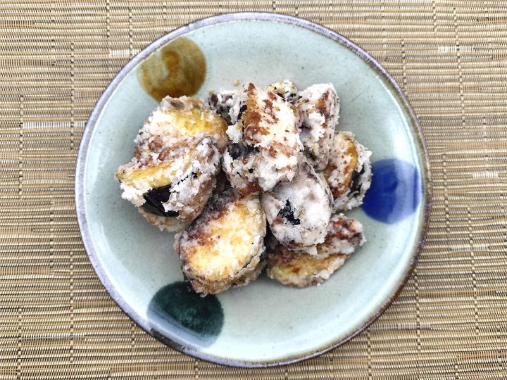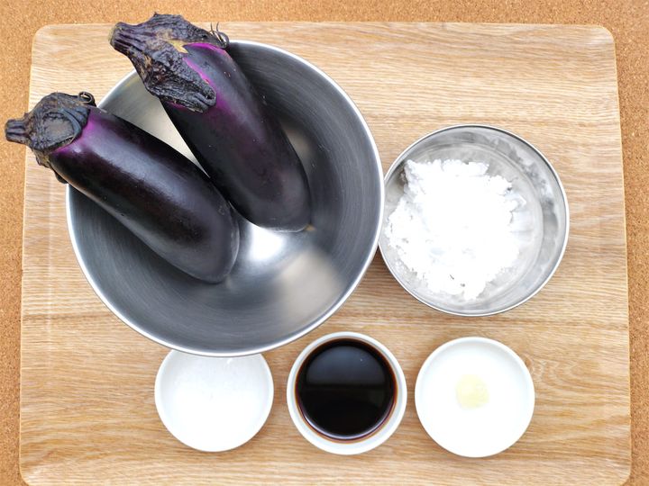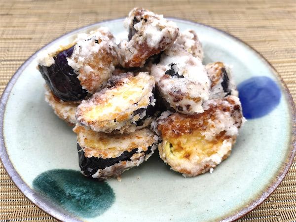 なすは油ととても相性のよい野菜で、油の吸収率が高いことでも知られています。そこがおいしさのひとつであると同時に、油をあまり摂りたくない人にとっては敬遠される原因のひとつでもあります。このレシピはなすに調味料と塩で下味をつけることで、油の吸収を妨げつつおいしい味に仕上がるというまさに一石二鳥の技を使っています。衣に片栗粉を使っていることもあって表面がカリカリですので、まるで綺麗に揚がった天ぷらのような食感でもあります。