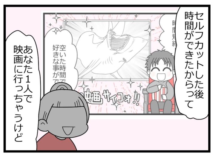夫が自慢気に話していたセルフカットや、あいた時間で映画鑑賞は妻の時間を犠牲にしたうえで成り立っていることにようやく気付いた夫。独身時代であればそれで良かったのでしょうが、家族ができても同じように過ごすというのは無理がありますよね。しかも、子どものことを全く頭に入れていないなんて言語道断です。