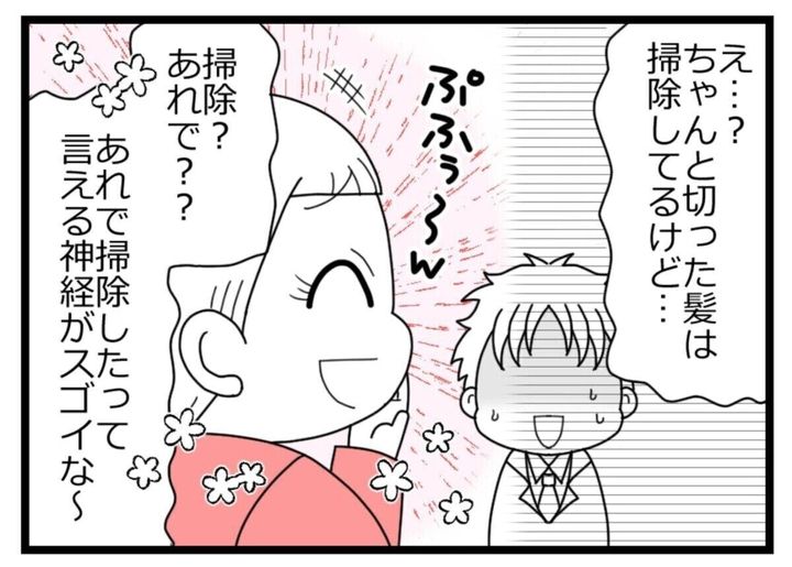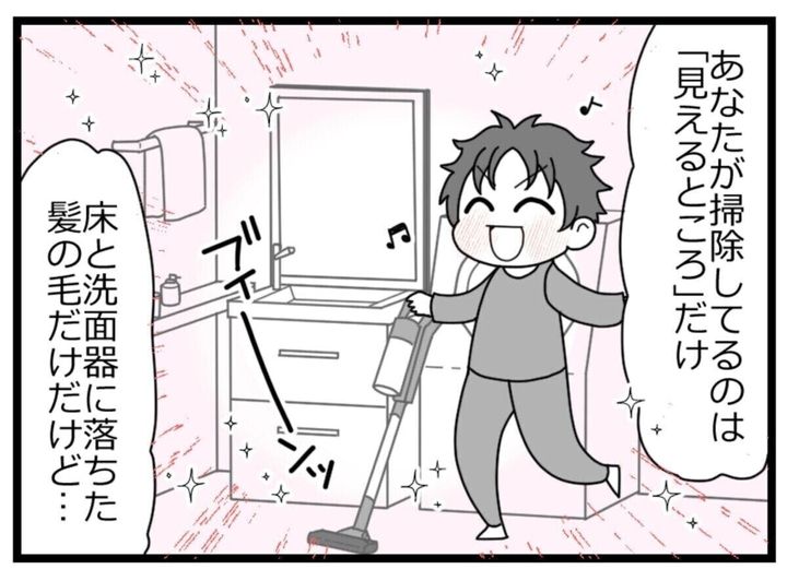 夫が自慢気に話していたセルフカットですが、その後始末をするのは妻。夫は見えるところは掃除しているものの、排水溝や鏡など気づきにくい場所は結局妻がやっていたのでした。美容室へ行けば確かに時間もお金もかかりますが、それはすてきな髪型にしてくれるだけではなく準備や後片付けもやってくれる対価が含まれているからですよね。そのことを夫は気付いていなかったようですね。