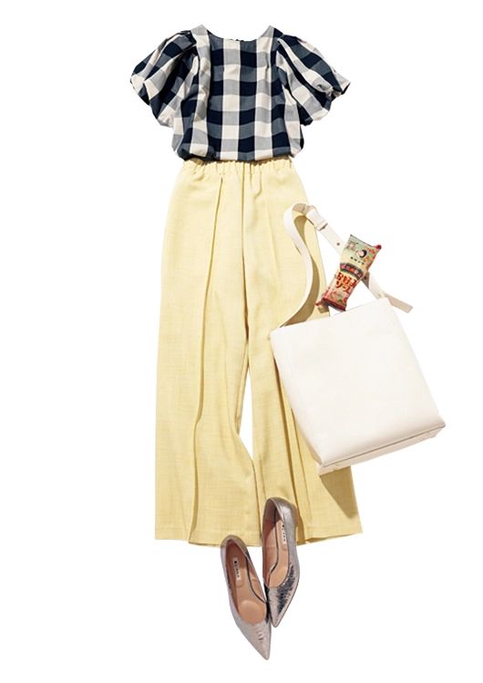 ギンガムブラウス¥4,500/クチュール ブローチ イエローセットアップ(パンツ)¥17,600/ミラ オーウェン ルミネ新宿2店 シルバーパンプス¥16,500/ダイアナ(ダイアナ 銀座本店) トートバッグ¥13,000/PLST オタフクソース/編集部私物