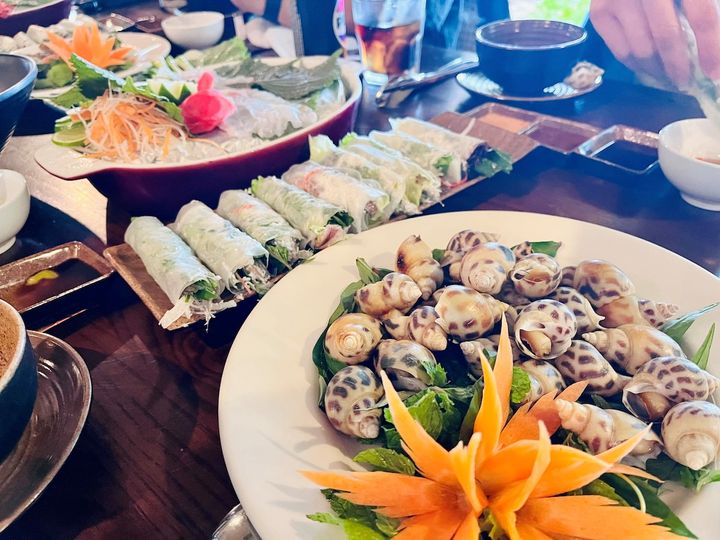 ハタの皮を使った唐揚げや刺身、ほかほかに蒸されたタニシ、春巻は生と揚げを食べ比べできます。タニシは味というよりもほくほくとした食感を楽しむような感じ。また、春巻き系は唐辛子のピリッとした辛さが特徴的なつけダレがエスニックな味わいで美味でした。