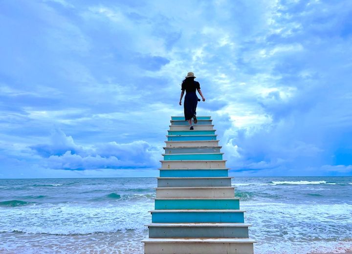 1番映えていたのは、こちらの階段で撮った1枚。海にせり出していて結構怖いのですが、海と空だけを映して撮影すると「どこで撮ったの?」的な写真になります。