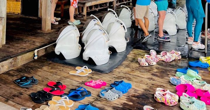 水着に着替えてスタンバイ。水着はレンタルもあります。このヘルメットに酸素チューブが繋がっており、たくさん酸素を送り込むことで中に水が入ってこないようにします…これが命綱か…。水深5mまで潜るため、1人ずつ丁寧な耳抜きのレクチャーを受けてから入りました。この時間が一番緊張MAX、写真を見返すと明後日を見るまなざしになっていました。
