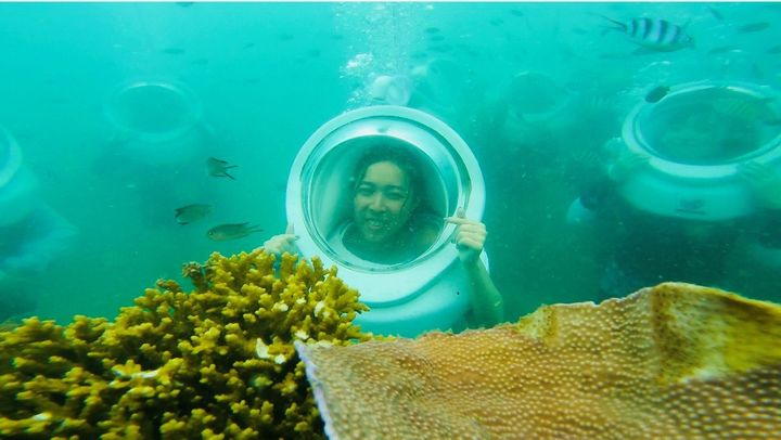 ホントム島ウォーターパーク「AQUATOPIA」に入場したら、人気コンテンツ「Sea Walk」体験をするために、園内の端にある船乗り場から専用ボートで移動。ここでは、水深約5mまで潜って歩く体験ができます。