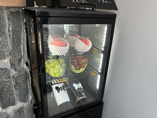 中に入るとグレーでオシャレな雰囲気。すぐ目の前の冷蔵庫には見るからに美味しそうなフルーツが並んでいます。 お客さんから見えるところに置いてあるということは品質に自信がある証拠ですよね。期待値が上がります!