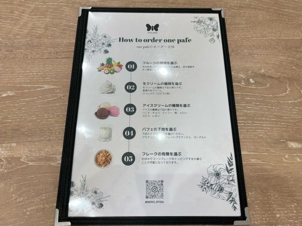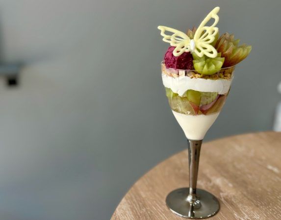 この蝶のモチーフ、こちらはアーティストをされているオーナーの弟さんがデザインしたものだそうです! パフェを花に見立てて、そこに寄って来る蝶をイメージされたそうです。とてもオシャレで可愛らしいです♪
