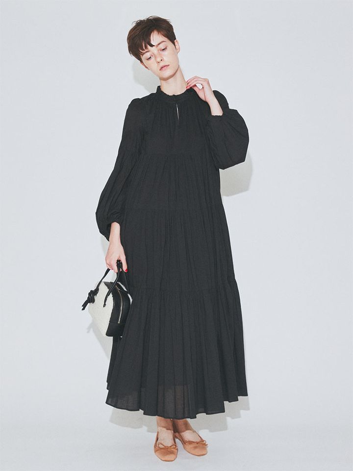 【POINT】ドレスは地味にうれしい裏地つき。足首まで長さがあるぶん、靴は黒よりベージュのフラットシューズで抜け感を意識。甲のリボンと襟もとのフリルでささいに甘さを演出すると、暗色ワントーンでも単純に見えない。