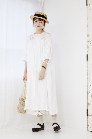 もふんわりで締め付け感がまったく無いワンピースなので残暑の今もとにかく涼しいです。重ね着はパンツだと暑いので、ペチスカートに。チラッと見せるレースでかわいさをプラスしてみました」