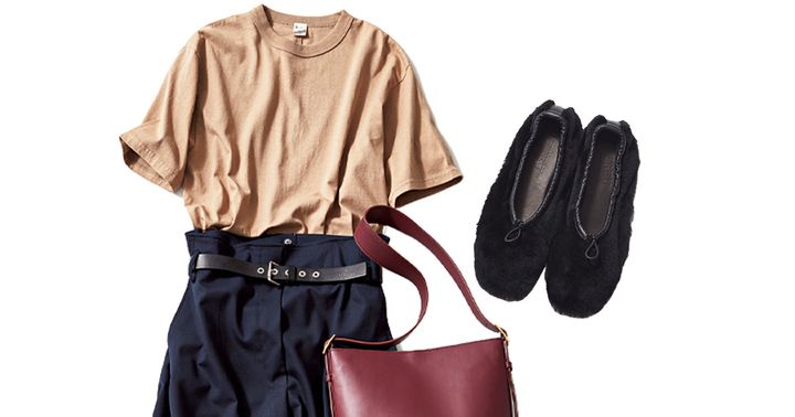 今季トレンドのもこもこ靴は残暑こそ取り入れ時!つくおきコーデの味チェンにぴったりで、ワクワク感が復活。見た目も癒し系でうっかり家の中でも履きたくなる心地良さ♡バレエシューズ[H1㎝]¥78,100(ヘリュー/ヘリュージャパン オフィシャルオンラインストア)Tシャツ¥8,580(スクリーン スターズ/ビームスボーイ 原宿)ベルト付きパンツ¥64,900バッグ¥79,200(ともにTELA/ティースクエア プレスルーム)