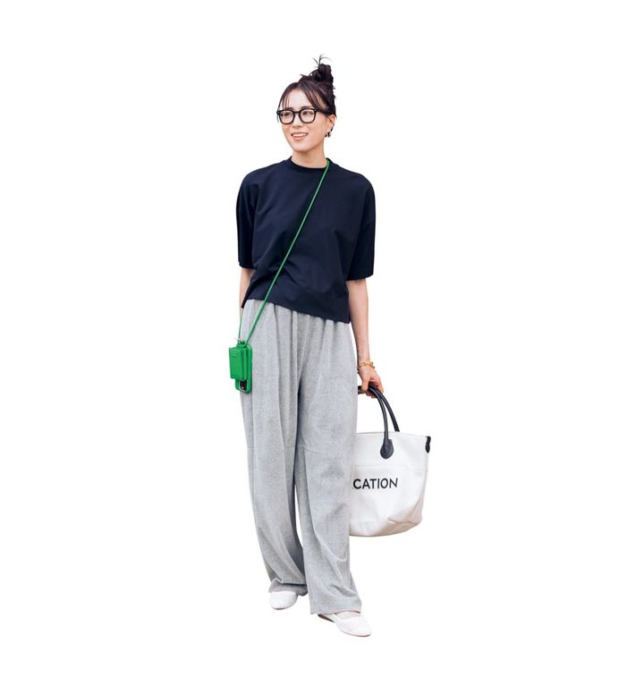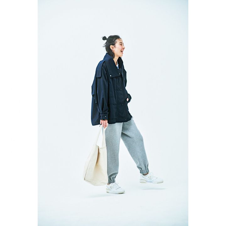 部屋着っぽくもあるゆるめのスウェットパンツですが、ネイビーのアウターと合わせることでメリハリのあるオシャレに。ほかにも、テーラードジャケットやコクーンジャケットなど、お馴染みのキレイめ羽織りと好相性です。パンツはエイトンステイプルズ、ブルゾンはアダム エ ロペ、バッグはケルティ、スニーカーはニューバランスのもの。