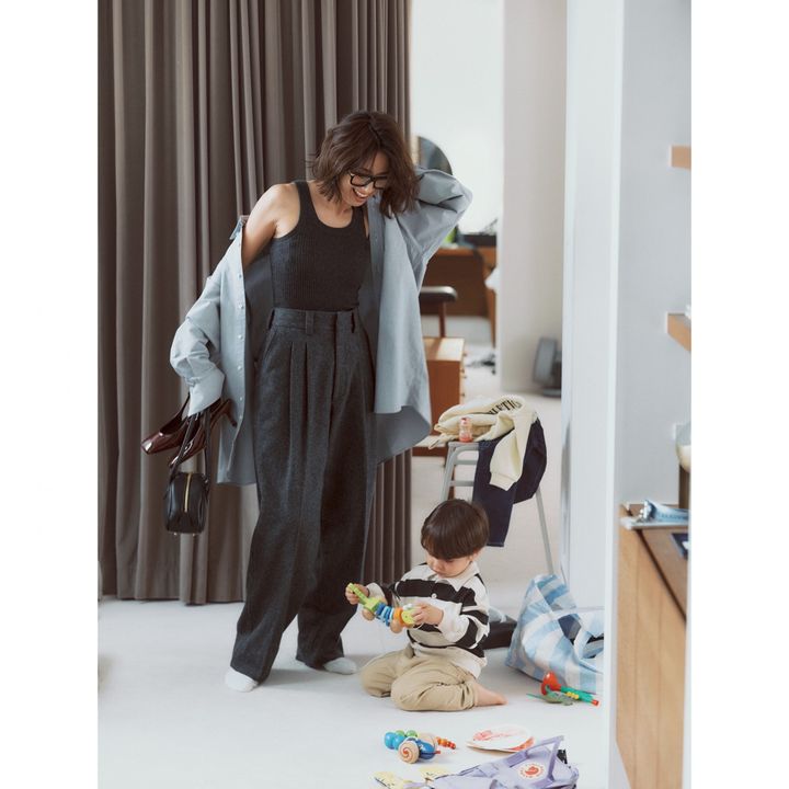 タックパンツのきちんと感に大人のゆるさを足してくれるのが羽織りシャツ。コンパクトなインナーをインして上から羽織ればゆるすぎにはならず、体形カバーできて今年っぽくなれるコーディネートです。寒くなってきたらタンクトップの代わりにタートルネックを合わせるのがおすすめ。パンツはシンゾーン、シャツはインディビジュアライズド シャツ、タンクトップはピセア、バッグはウィズ グッド シューズのもの。