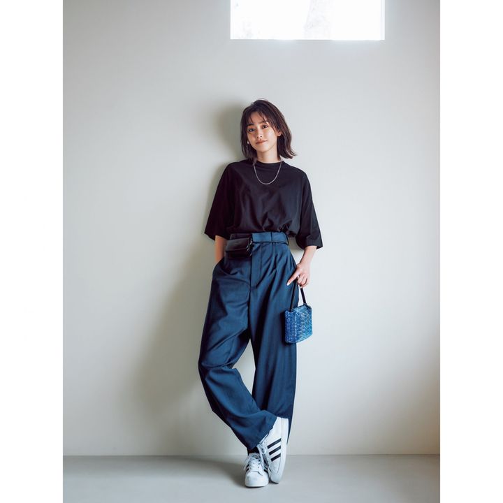 Tシャツ×ゆるパン×スニーカーというラフな合わせながら、黒とダークグレーの色合いで落ち着いた印象。上下黒も上下ネイビーとも違う、ツウなオーラが出ます。五分丈のTシャツは、9月10月の暑い日に活躍しそう。トップスはエイトン、パンツはロエフ、ウエストバッグはヤーキ、バッグはユナイテッドアローズ、スニーカーはアディダスのもの。