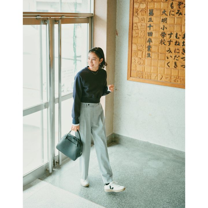 黒やネイビーなど、濃い色のスウェットはキリッとした印象で使えるので、キレイめパンツとも違和感なく合わせられます。スウェットを無難に見せないように、袖からチラッとインナーを覗かせて。マニッシュなカジュアルで、仕事や街にも繰り出せそう。パンツはエリオポール、スウェットはチノ、バッグはメゾン カナウ、スニーカーはヴェジャのもの。