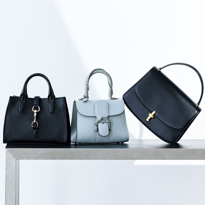 〈右から〉バッグ「ソフィア 10.00」[H18×W25×D19㎝]¥614,900(ザ・ロウ/ザ・ロウ・ジャパン)、バッグ「ブリヨン ミニ」[H16×W20×D11.5㎝]¥1,162,700(デルヴォー)、バッグ[H17.5×W24×D8.5㎝]¥517,000(グッチ/グッチ クライアントサービス)