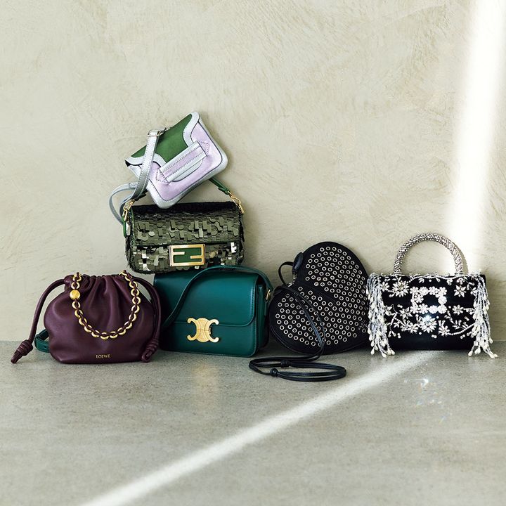 〈右から〉バッグ「ラマージュ ジュエル フラワー ストラス」[H13×W19×D4㎝] ¥1,329,900(ロジェ ヴィヴィエ/ロジェ・ヴィヴィエ・ジャパン)、バッグ「ル クール」[H17×W21×D5㎝]¥210,100(アライア/リシュモン ジャパン アライア)、バッグ「アルファ ポーチ」[H10.5×W15㎝]¥60,500(ピエール アルディ/ピエール アルディ 東京)、バッグ「ミニ バゲット」[H13×W20×D5㎝]¥492,800※予定価格(フェンディ/フェンディ ジャパン)、バッグ「ティーン トリオンフ」[H13.5×W18.5×D7㎝]¥533,500※予定価格(セリーヌ バイ エディ・スリマン/セリーヌ ジャパン)、バッグ「フラメンコパース ミニ」[H17×W23×D5.5㎝]¥394,900(ロエベ/ロエベ ジャパン クライアントサービス)