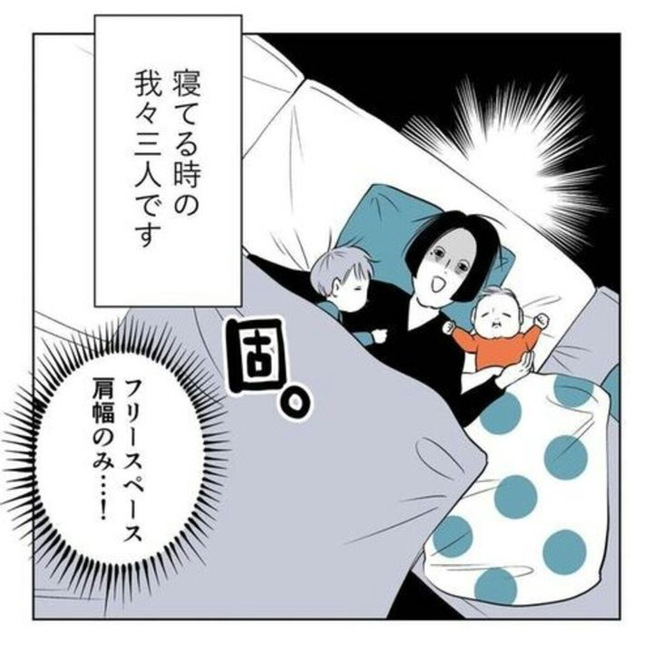 長男がパパと寝たくないと言うため密な就寝方法になっていますが、子どもたちが風邪を引いた日には「飛まつのシャンパンファイト」がニンカシさんに降り掛かります。1人がせきやくしゃみをすれば、その2日後にはもう1人、そしてさらに1人と家族がゆっくり床に伏せていく…風邪の連鎖を止めるには、密を回避する就寝方法を子どもたちにお願いするしかなさそうです。