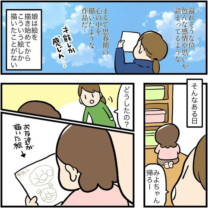 子どもの描く絵は独特で、見ているだけで楽しいですよね。ときには「これは芸術的!」と感じるわが子の傑作を目にすることも。この記事では、もす(@mosumanga30)さんの漫画から、娘さんの絵を見た時のエピソードをご紹介。わが子の絵を鑑賞するもすさんの思いにほっこりしますよ。