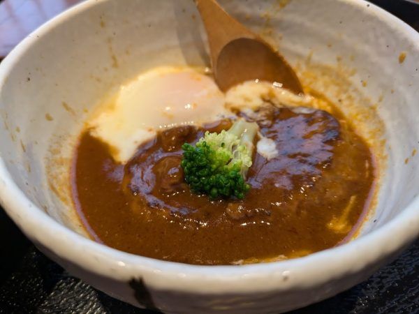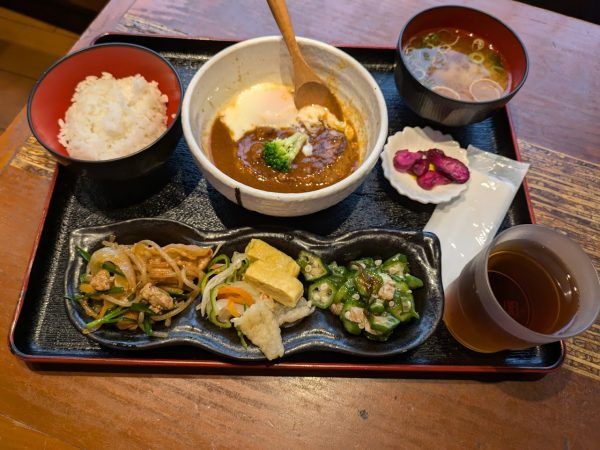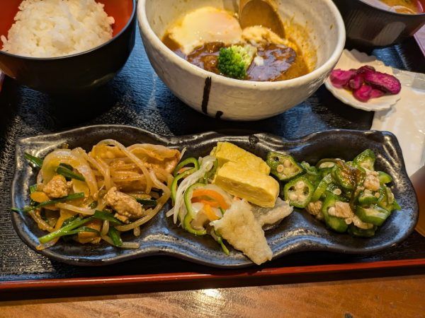 温泉玉子を割る瞬間が最高ですね。黄身がどろ~んと流れ込んで、デミ味噌煮込みハンバーグの肉汁と混ざっていきます。これはご飯がススム系のメインですね。これはすごいですね。おかずがたくさんあって、ご飯とお味噌汁がおかわりできる!バランスよく満腹になれる食堂でした。