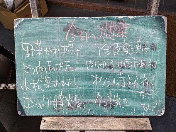 「今日のお惣菜」は、野菜かき揚げ・ニラ肉チャプチェ・小松菜のおひたし・こんにゃく甘辛炒め・アジ南蛮漬け・肉団子甘酢あん・オクラ山芋ネバネバ・たこ焼きなどです。おかずがいっぱい!これは素晴らしい。