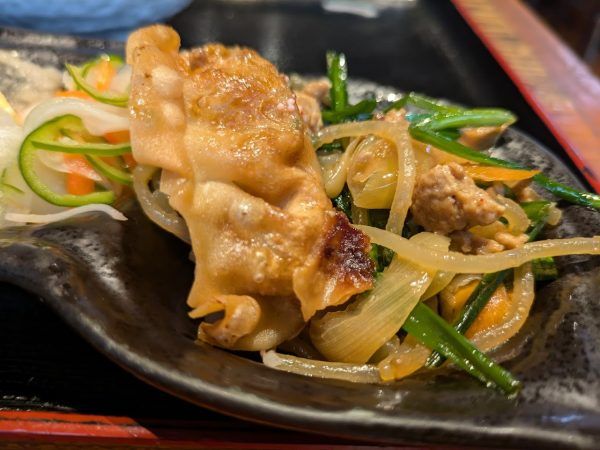 ニラ肉チャプチェと焼き餃子、お皿の中は多国籍ですね~。