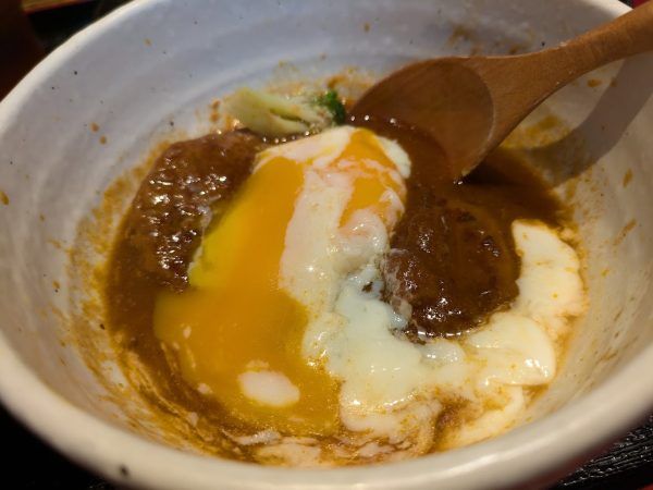味噌煮込みハンバーグ!デミグラスソースと味噌の煮込み!和洋折衷のハンバーグ!ソースの匂いがまろやかな感じになっています。プラス温泉玉子がド~ンと!いいですね~。
