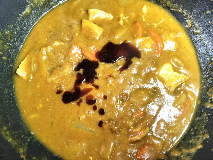 5. カレー粉を加えたら弱火にしてよく混ぜ、煮ている鍋からスープをお玉半分ほど加えてさらによく混ぜます。