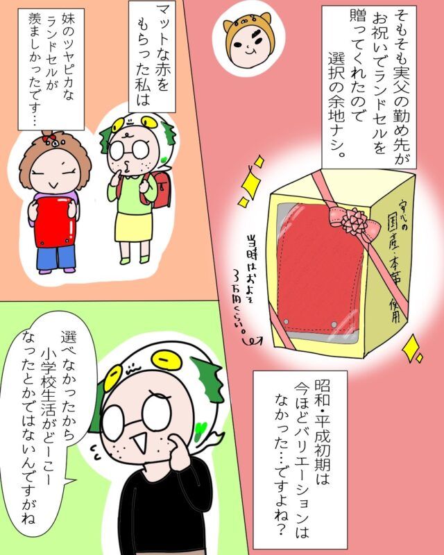 30年前とは違ってカラーバリエーションも豊富、道ゆく小学生の背中もカラフルで「ウチの子もあんな感じの背負うのかー」とぼんやり・・・してられない!!笑