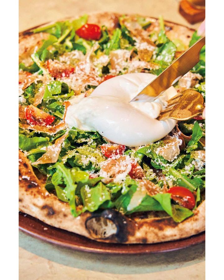 北海道産小麦を中心に配合した生地を素焼きにして、瑞々しい具材を彩りよく。千葉・館山「須藤牧場」の生乳を使う自家製ブッラータは雑味なく、ミルキーなコクが広がる。4P’sシグネチャーブッラータ、生ハム、ルッコラ since2013¥3,280