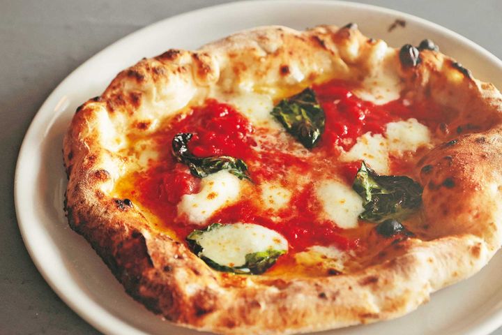 トマトソース、モッツァレラチーズ、バジルからなる王道の一枚。シンプルな具材ゆえに生地の美味しさが際立つ。マルゲリータ¥1,980