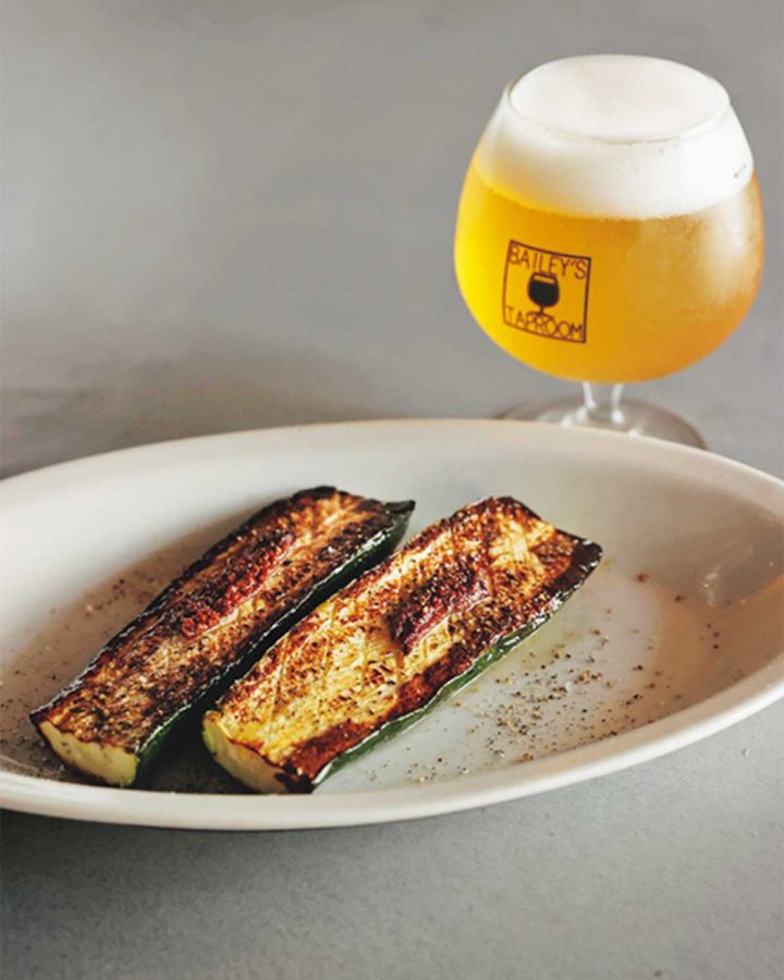 柔らかくジューシーに焼き上げたズッキーニにアンチョビの旨みを添えて、ビールが進む一品に。ズッキーニとアンチョビ¥990、ポートランドのクラフトビール475㎖¥1,760